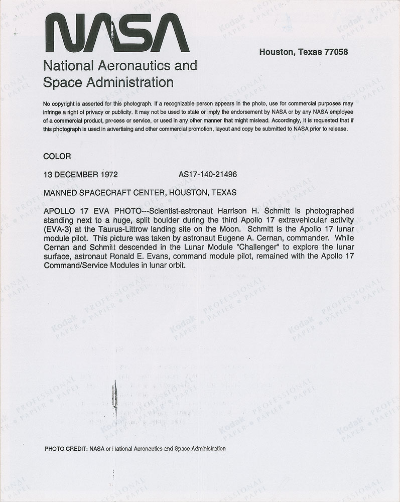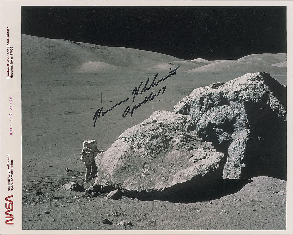 Official color semi-glossy 10 x 8 red-numbered NASA photo of LMP Schmitt standing next to a large split boulder on the lunar surface, signed in black felt tip, "Harrison H. Schmitt, Apollo 17." In fine condition. From The Bill Lende Collection.