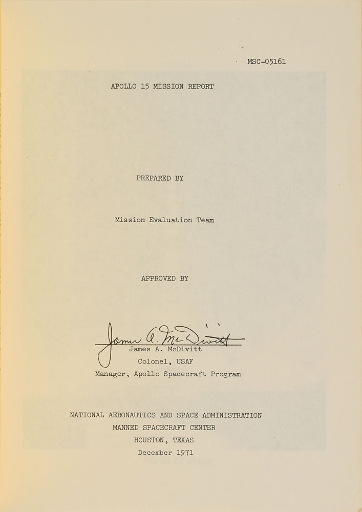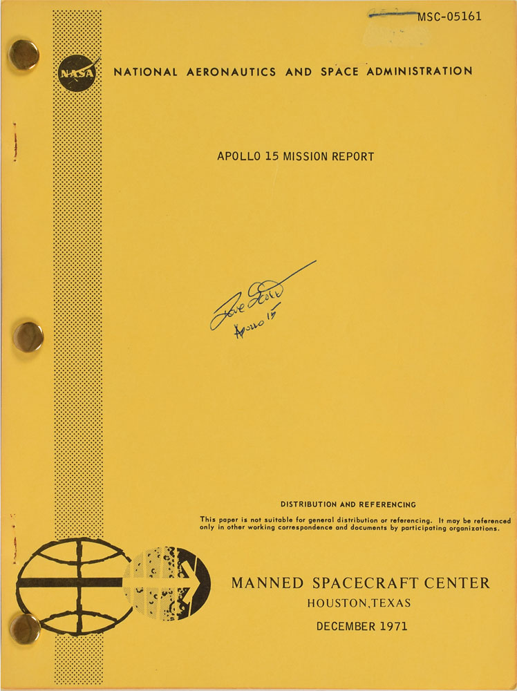 Brad-bound manual entitled "Apollo 15 Mission Report," MSC-05161, 8 x 10.5, approximately 324 pages, December 1971, signed on the front cover in blue ballpoint, "Dave Scott, Apollo 15." The report offers details on the flight's trajectory, experiments conducted on the lunar surface, inflight science and photography, performance of the CSM and LM, and general evaluations. It features a few pull-out charts and images. In fine condition, with staple holes to left edge, a struck-through notation at the top of the front cover, handwritten title on spine, and toning to the back cover. From The Bill Lende Collection.