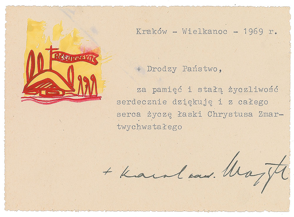 TLS in Polish, signed “Karol card Wojtyla,” one page, 5.75 x 4, illustrated 'Resurrexit' stationery, Easter 1969. In full (roughly translated): "Ladies and gentlemen, For the memory and constant sympathy, heartily thank you from the whole heart will wish the grace of the Christ of the Risen." In fine condition.