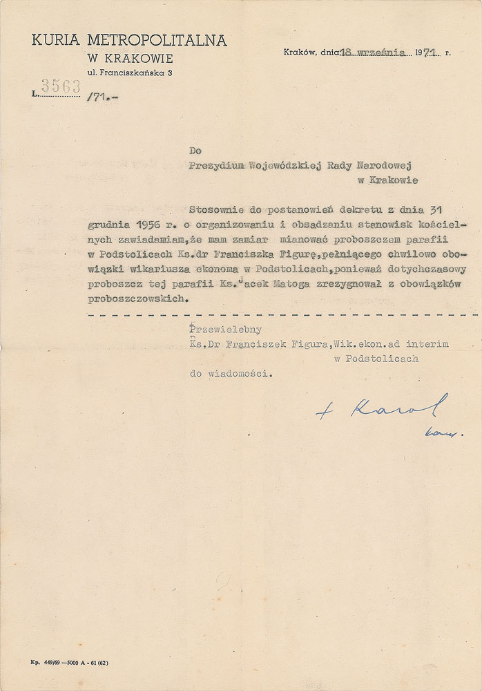 TLS in Polish, signed “Karol card,” one page, 8.25 x 11.75, Kuria Metropolitalna letterhead, September 18, 1971. Letter to the Presidium of the National Council of the Krakow, in full (roughly translated): "According to the decree of 31 December 1956 on the organization and filling of church posts, I inform that I intend to serve as the pastor in the sub-parish of Don. Fr. Francis Fig, currently serving as vicar of the Econom in the Podstolicach, because the pastor of this parish Fr. Jacek Matoga resigned from parish duties." In fine condition.