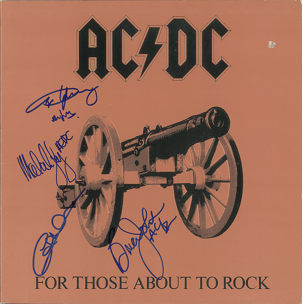 For Those About to Rock album signed on the front cover in blue felt tip by Angus and Malcolm Young, Brian Johnson, and Cliff Williams, with all but the latter adding "AC/DC." In fine condition, with a price reduction hole to the upper right. The record is not included. Consignor notes that the signatures were obtained at the Holiday Inn in Auburn Hills, Michigan, on August 3, 2000.