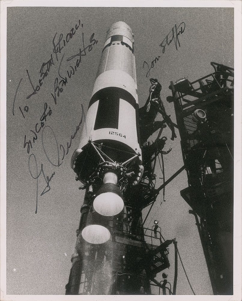 Matte-finish 8 x 10 photo of the Titan 2 rocket launching with the Gemini 9 spacecraft on June 3, 1966, signed and inscribed in black felt tip, "To Joseph Fricelli, sincere best wishes, Gene Cernan" and "Tom Stafford.” Reverse bears a United Press International Photo stamp. In fine condition.