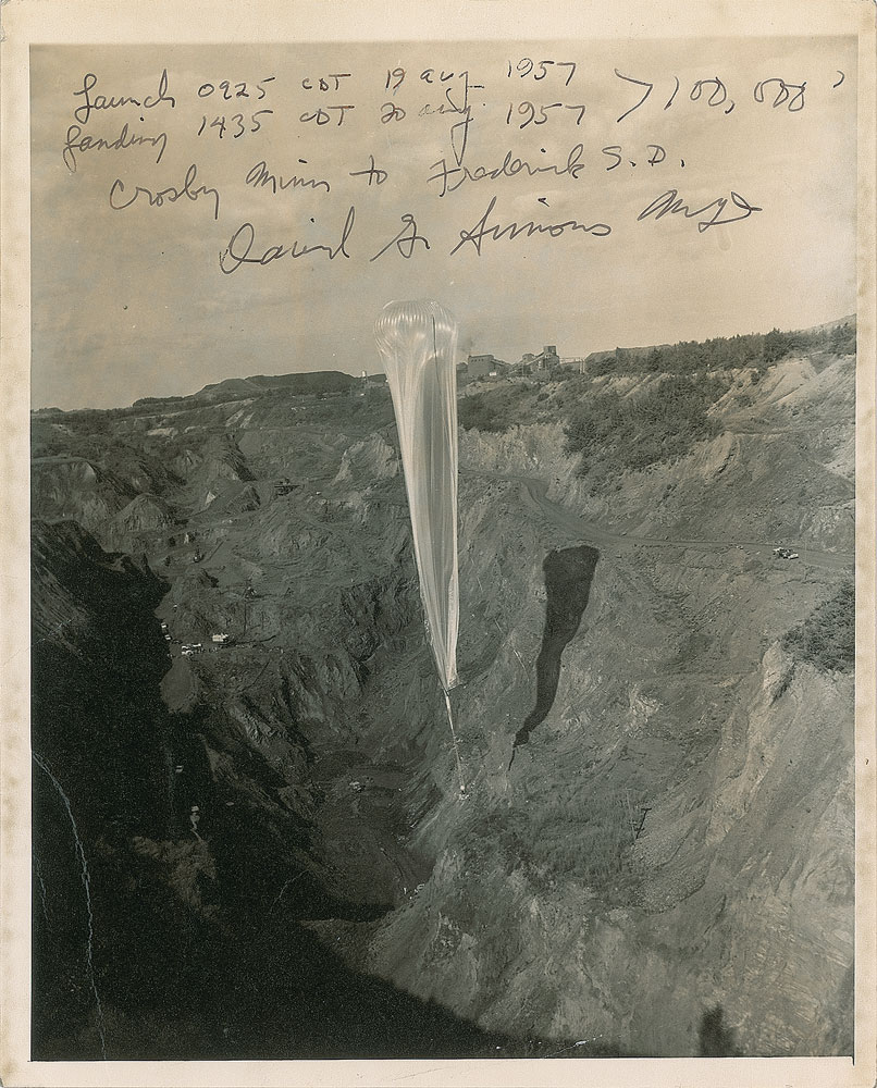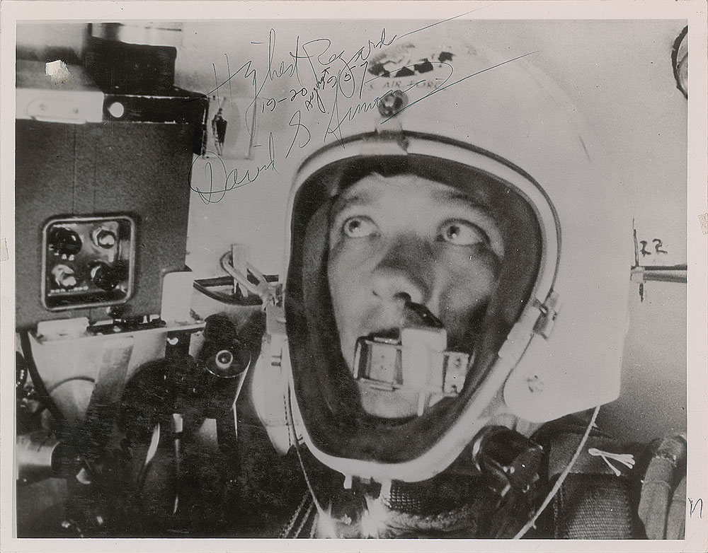 American physician turned US Air Force lieutenant colonel (1922-2010) who, as part of Project Manhigh, set a record of high-altitude balloon flight in 1957 at 19 miles above the Earth in an aluminum capsule. Two signed photos: a glossy 10.25 x 8 of Simons inside his gondola as it rises to a record height of more than 100,000 feet, signed in black ballpoint, "Highest Regards, David G. Simons," near collector's ink notations; and a matte-finish 8 x 10 photo of Simons's balloon ready to take off from the bottom of an open-pit iron mine near Crosby, Minnesota, signed in fountain pen, "Launch 0925 CDT 19 Aug 1957, Landing 1435 CDT 20 Aug 1957, >100,000´, Crosby Minn to Frederick S.D., David G. Simons, Mjr," with the reverse bearing a Wide World Photos stamp. In overall fine condition, with some creasing to the matte-finish photo. Accompanied by a transmittal letter from Simons's secretary, dated September 16, 1957, addressed to noted collector Cornelius Greenway.
