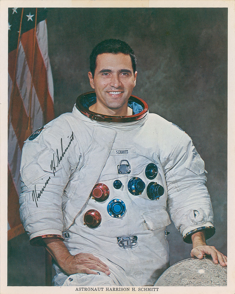 Official color 8 x 10 NASA lithograph of Schmitt posing in his Apollo 17 space suit, signed in black ink, "Harrison H. Schmitt." In fine condition, with a light vertical crease to the bottom, and a light central horizontal thin line of scuffing.
