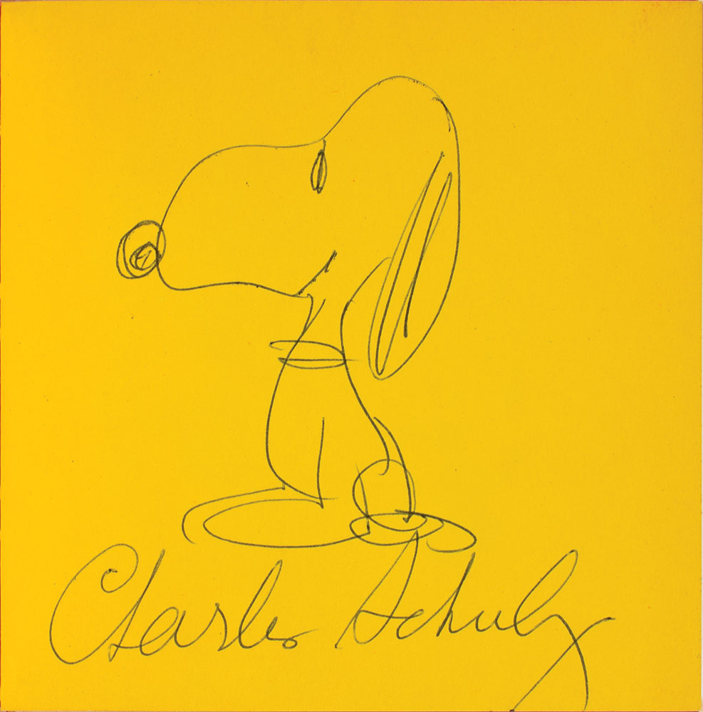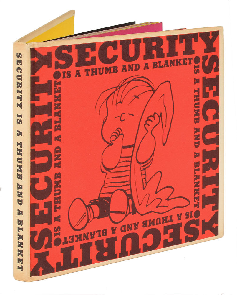 Signed book: Security Is a Thumb and a Blanket. First edition. California: Determined Productions, 1963. Hardcover, 5.75 x 5.75. Signed on the first free end page in ballpoint by Schulz, who fills out the page with a wonderful profile sketch of an obediently sitting Snoopy. In fine condition.