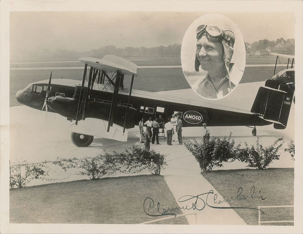 Aviation pioneer (1893-1976) who made the first non-stop flight from New York to Germany. Vintage matte-finish 8.5 x 6.5 photo of a Curtis T-32 Condor biplane resting on an airstrip, with inset oval portrait of Chamberlin to upper right, signed in fountain pen, "Clarence D. Chamberlin." In very good to fine condition, with scattered creasing.