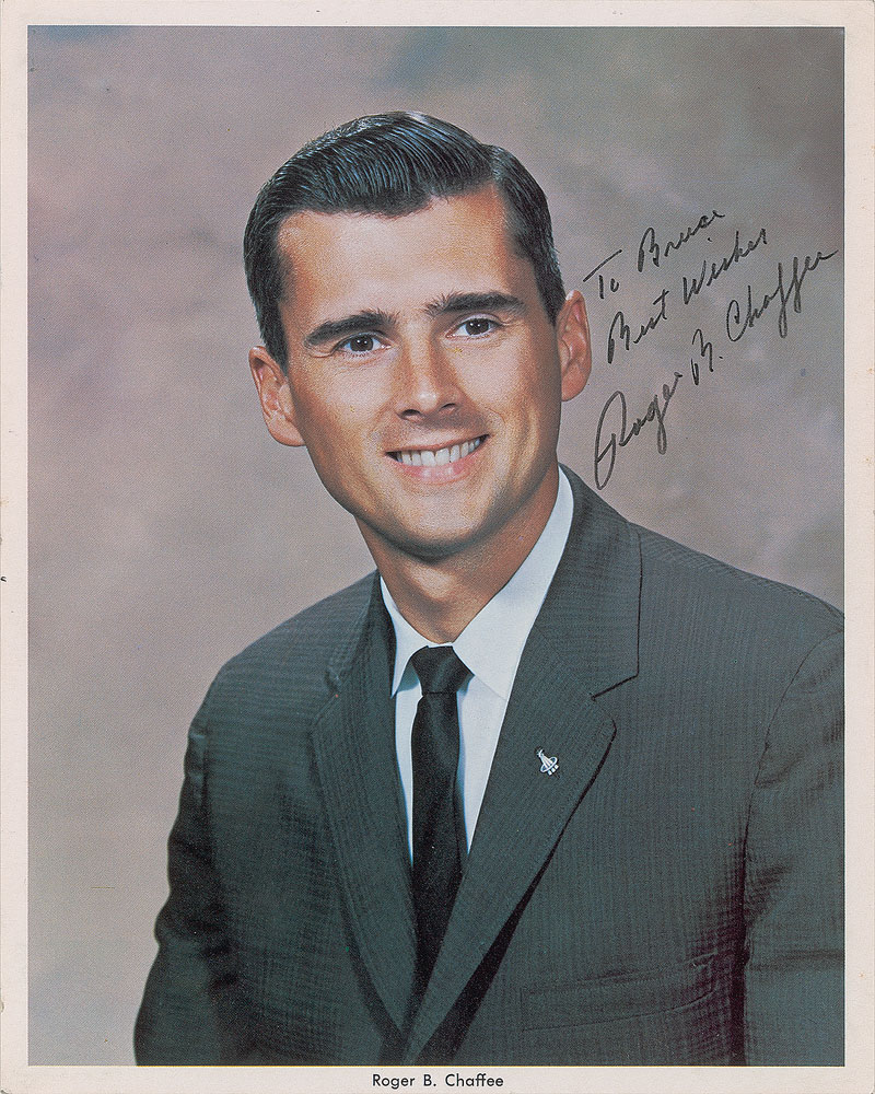 Rare official color 8 x 10 NASA lithograph of Chaffee, one of the tragic heroes of Apollo 1, signed and inscribed in black felt tip, "To Bruce, Best wishes, Roger B. Chaffee.” In fine condition. Accompanied by a full letter of authenticity from JSA.