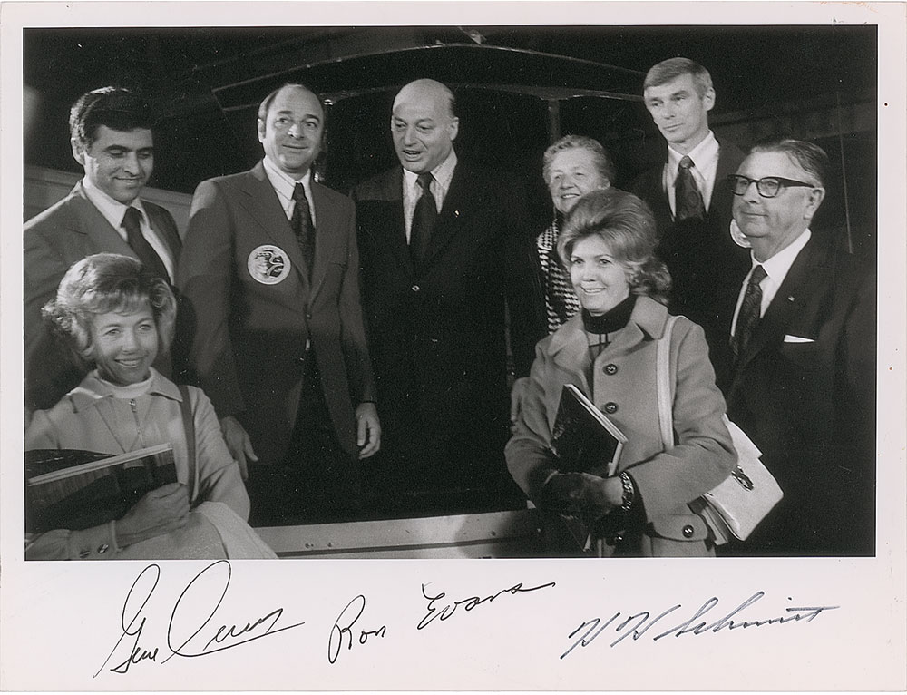 Uncommon matte-finish 10.25 x 8 photo of the Apollo 17 crew posing with some family members, signed in the lower border in black ink and felt tip, "Gene Cernan," "Ron Evans," and "H. H. Schmitt." In fine condition.