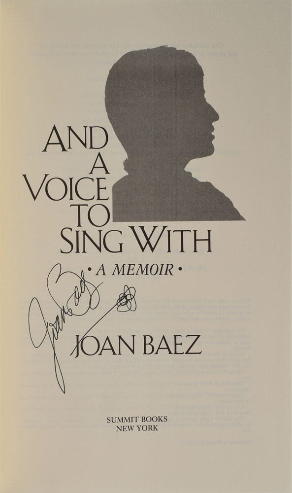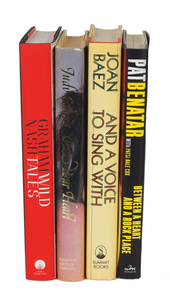 Group of four books, all hardcover with dust jacket, each signed inside by the associated musician: Wild Tales, signed by Graham Nash; Trust Your Heart, signed by Judy Collins; And a Voice to Sing With, signed by Joan Baez; and Between a Heart and a Rock Place, signed by Pat Benatar. In overall fine condition, with remainder marks to the bottoms of two books.