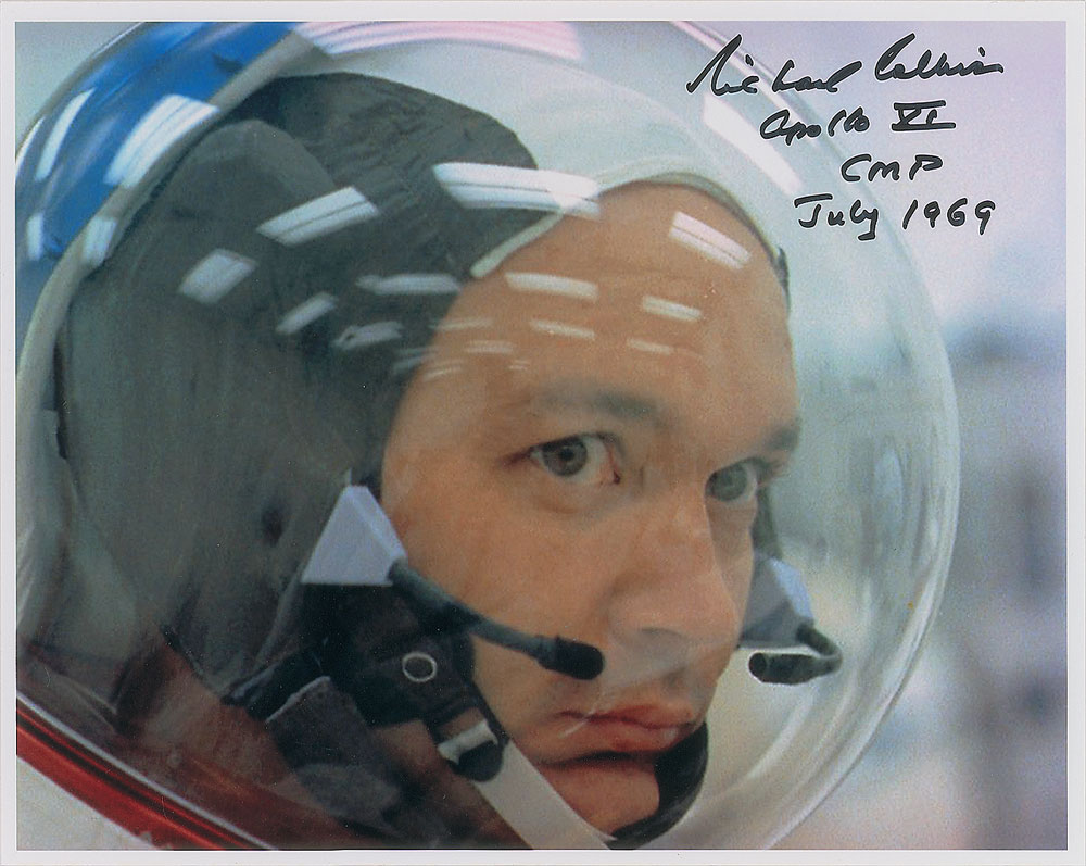 Color satin-finish 8 x 10 close-up photo of Command Module Pilot Collins wearing his space suit on launch day, nicely signed in black felt tip, "Michael Collins, Apollo XI, CMP, July 16, 1969." In very fine condition.