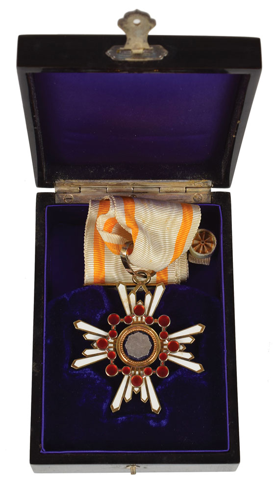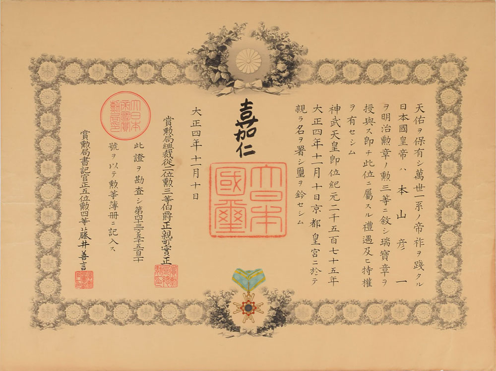 Impressive DS in Japanese, one page, 23.25 x 17.75, November 10, 1915. Untranslated document in which Emperor Taisho confers the Third Class, Order of the Sacred Treasure upon important newspaper publisher Motoyama Hikoichi. Includes the award medal with neck ribbon and lapel pin in its original black lacquer case, as well as the document's wooden box. In fine condition, with some scattered wrinkling and creasing. Established as the Order of the Meiji in 1888, the Order of the Sacred Treasure is awarded to those who have made distinguished achievements in a wide variety of civil or military services, ranging from research fields, to social work, to state and local government.