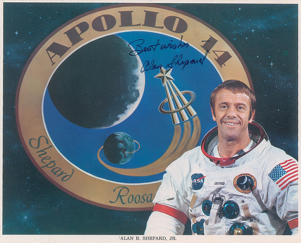 Official color 9.75 x 7.75 NASA lithograph of Shepard posing in his white space suit against an Apollo 14 insignia background, signed in blue felt tip, "Best wishes, Alan Shepard." In fine condition, with lightly trimmed borders.