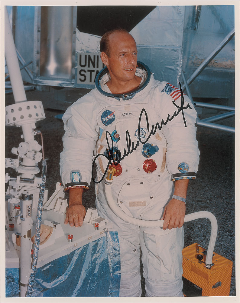 Color glossy 8 x 10 photo of Conrad posing in his white space suit, signed in black felt tip. In very fine condition.