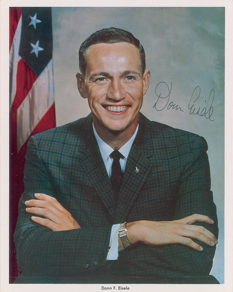 Uncommon official color 8 x 10 NASA lithograph of Eisele with his arms crossed, signed in black felt tip. In fine condition, with a horizontal crease running across the bottom, just above the border.