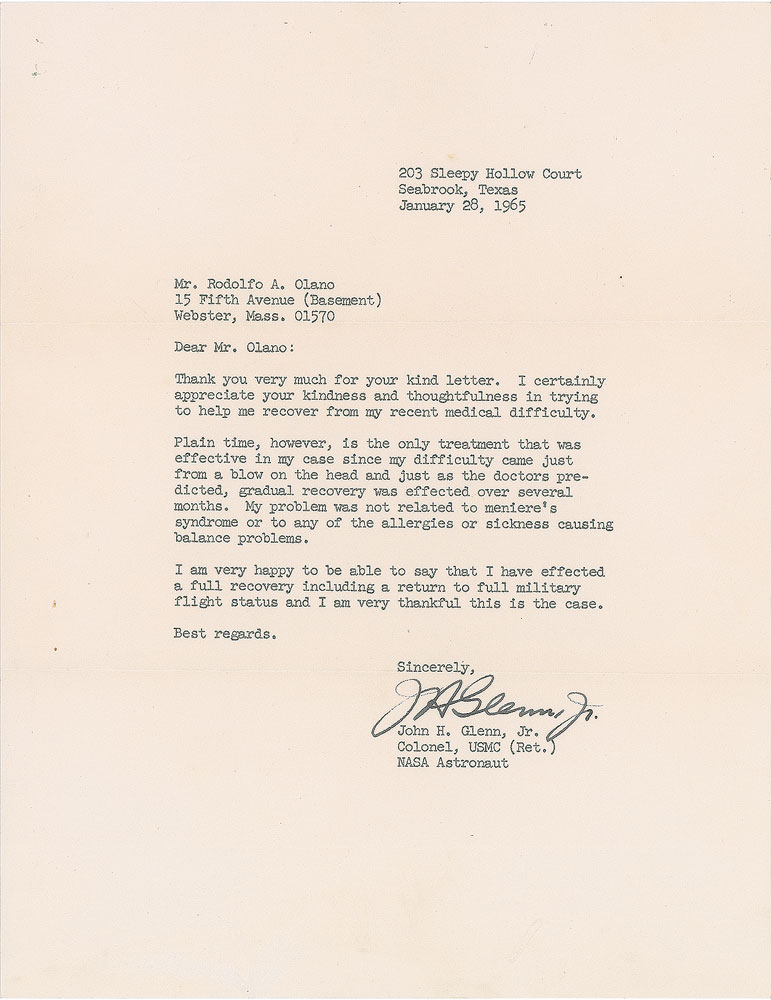 TLS signed “J. H. Glenn, Jr.,” one page, 8 x 10.5, January 28, 1965. Letter to Rodolfo A. Olano, in full: "Thank you very much for your kind letter. I certainly appreciate your kindness and thoughtfulness in trying to help me recover from my recent medical difficulty. Plain time, however, is the only treatment that was effective in my case since my difficulty came just from a blow on the head and just as the doctors predicted, gradual recovery was effected over several months. My problem was not related to meniere's syndrome or to any of the allergies or sickness causing balance problems. I am very happy to be able to say that I have effected a full recovery including a return to full military flight status and I am very thankful this is the case." In fine condition, with scattered light creasing. Accompanied by the original NASA mailing envelope.