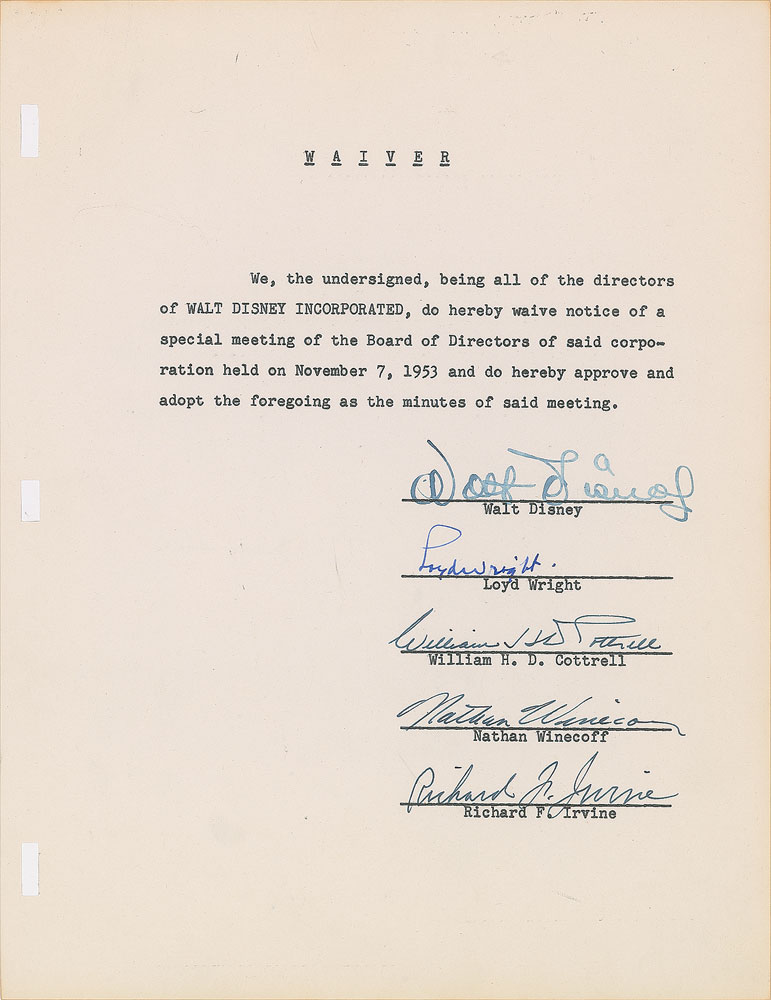 DS, signed “Walter E. Disney” and "Walt Disney," two pages, 8.5 x 11, November 7, 1953. Minutes of a special meeting of the board of directors of Walt Disney Incorporated, in part: "The President…stated that, in order to prevent confusion of the corporation's name with the name of Walt Disney Productions, the corporation's name should be changed. Whereupon, on motion duly made, seconded, and unanimously carried, it was Resolved that…The name of this corporation shall be WED Enterprises, Inc." Signed at the conclusion in fountain pen by Disney and countersigned by Nathan Winecoff as secretary. The second page is a waiver for the meeting, signed at the conclusion by the board members in attendance: Walt Disney, Lloyd Wright, William H. D. Cottrell, Nathan Winecoff, and Richard F. Irvine. In fine condition.