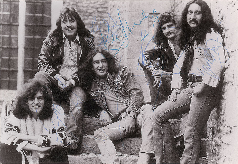 Vintage glossy 7 x 4.75 photo of Uriah Heep, signed in blue ballpoint by Ken Hensley, Lee Kerslake, Gary Thain, Dave Byron, and Mick Box. In fine condition, with moderate contrast to some of the signatures.