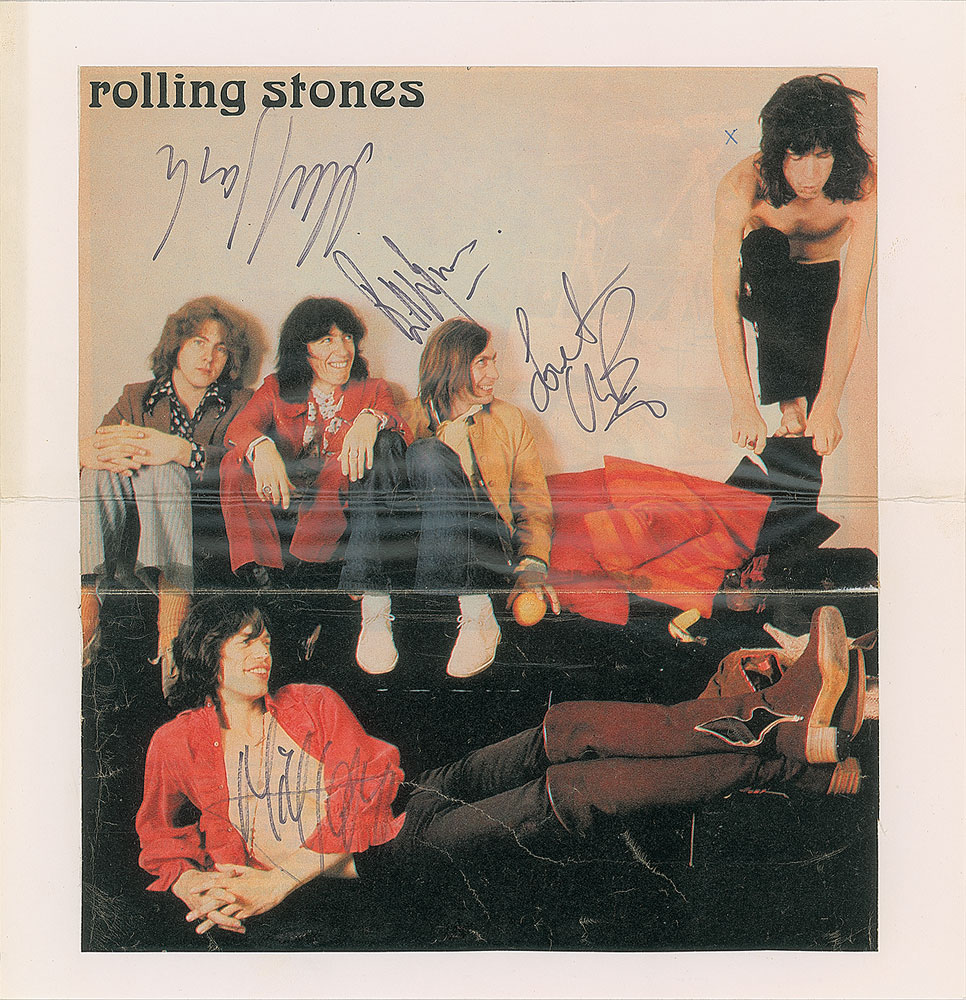 Vintage color 9.75 x 10.75 magazine centerfold photo of the Rolling Stones, signed in black felt tip by Mick Jagger, Bill Wyman, Charlie Watts, and Mick Taylor. Affixed to a slightly larger paperstock mount. In very good to fine condition, with scattered light creasing and two horizontal folds.