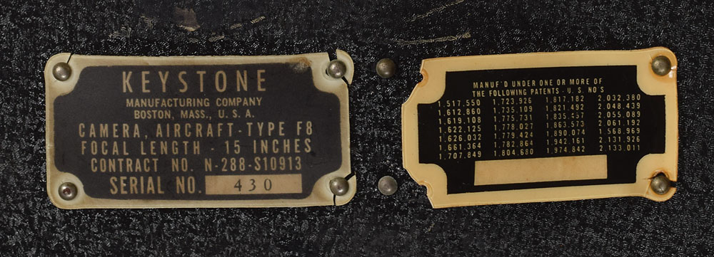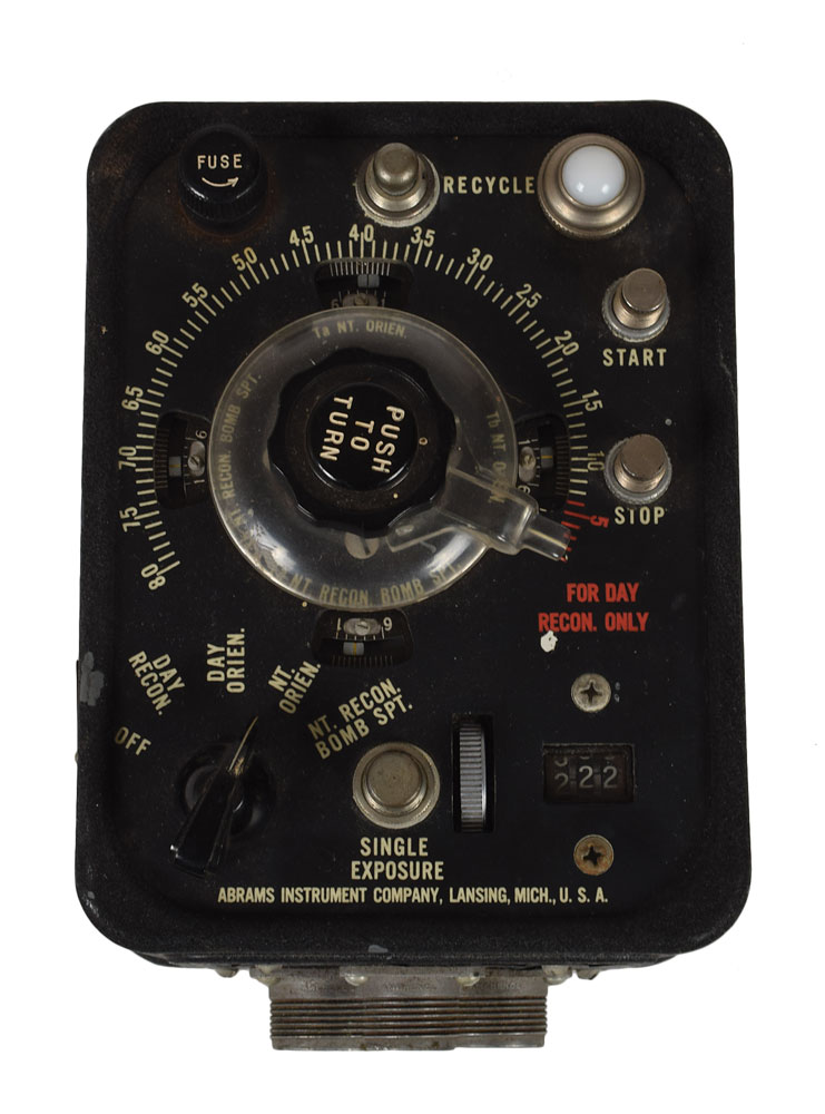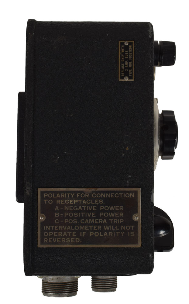 Dr. Harold Edgerton's circa 1940 Keystone F8 Aircraft Camera, measuring approximately 13.5 x 14 x 13.5, bearing a Keystone label on the side identifying it as: "Camera, Aircraft - Type F8, Focal Length - 15 Inches, Contract No. N-288-S10913, Serial No. 430." In very good to fine condition (working condition unknown). Provenance: The Naylor Collection, Guernsey's, 2007. Noted camera collector Jack Naylor had a decades-long friendship with Dr. Edgerton, a pioneer in the development of flash photography. Edgerton's most famous photograph is that of a bullet piercing an apple. Naylor's collection featured a number of items gifted to him by Dr. Edgerton, including a variety of photographic equipment attributed to Edgerton's ownership. Also includes an Abrams Intervalometer (Type B-7), a timing device for aerial cameras, which is not attributed to Edgerton.