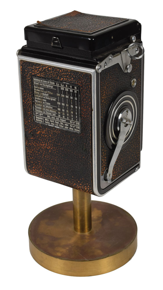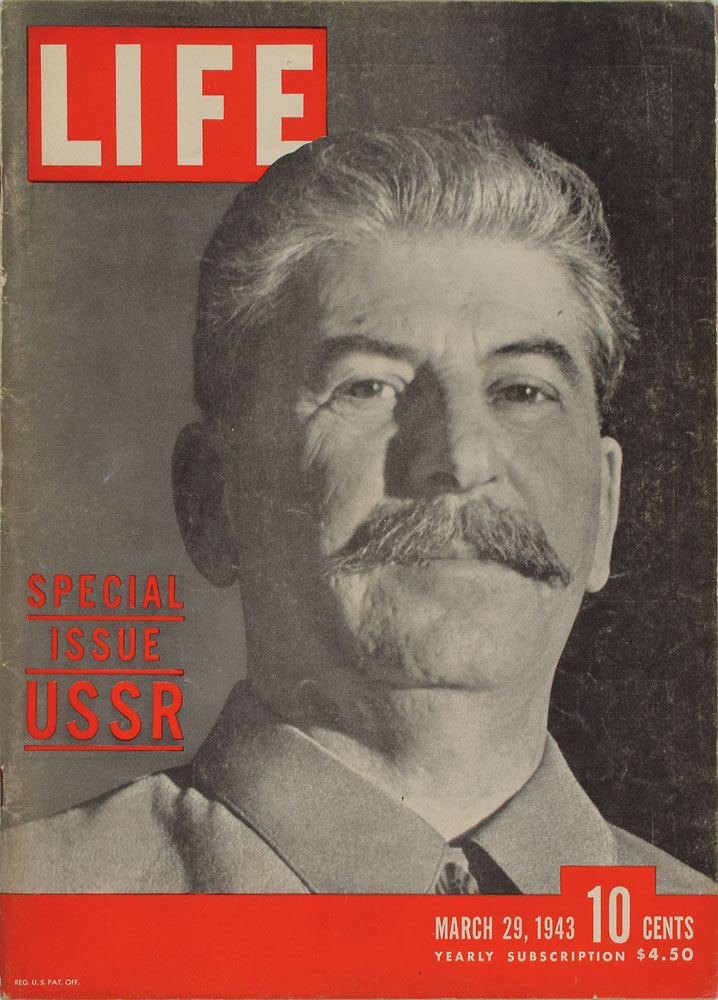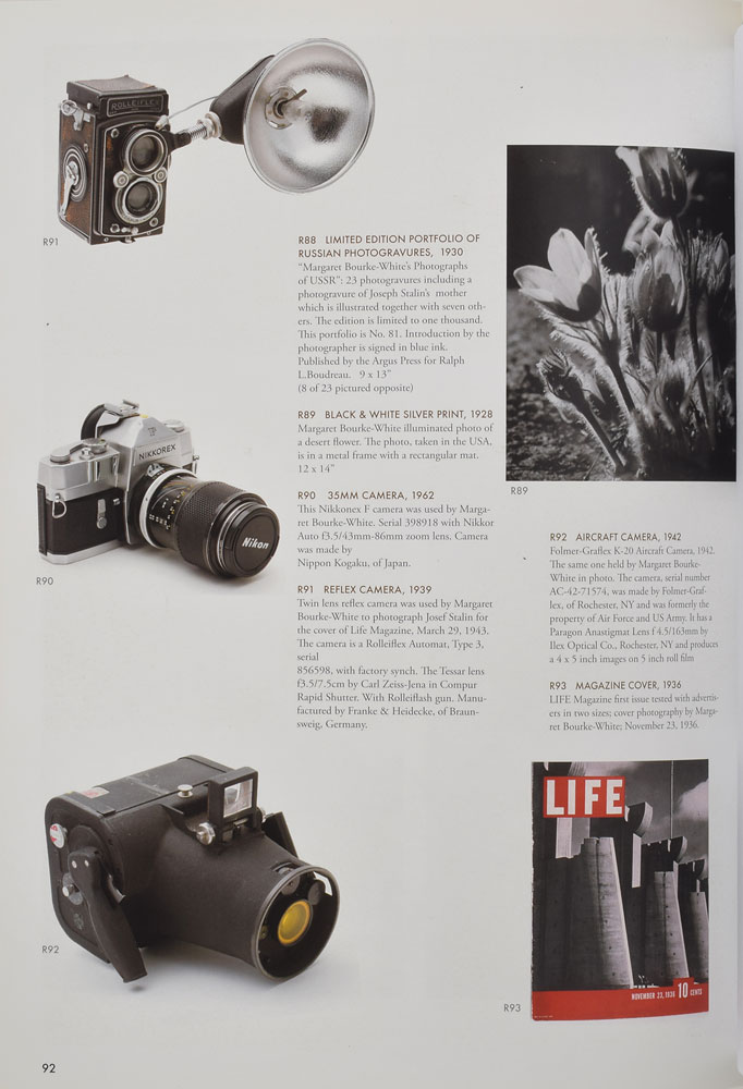 Margaret Bourke-White's Rolleiflex Automat (Type 3) twin lens reflex camera, serial number 856598, used to photograph Joseph Stalin in 1941 for a portrait which appeared on the cover of Life Magazine on March 29, 1943. The lens is a Tessar 1:3.5/f=7.5cm by Carl Zeiss Jena, serial number 2487162. Mounted on a display stand. In very good to fine condition (working condition unknown). Provenance: The Naylor Collection, Guernsey's, 2007. This was originally sold with an attached Rolleiflash gun, which is no longer present. Noted camera collector Jack Naylor became acquainted with Margaret Bourke-White during World War II, and they remained lifelong friends. Naylor's collection featured a number of items from Bourke-White, including photographs taken by her and camera equipment attributed to her use and ownership. Bourke-White had been the first foreign photographer permitted to take pictures of the Soviet five-year plan, and was the only foreign photographer in Moscow when German forces invaded. In her 1941 essay 'How I Photographed Stalin and Hopkins Inside the Kremlin,' she described Stalin's physical appearance and personality during their photo session. Accompanied by a complete copy of the 1943 issue of Life featuring Bourke-White's portrait of Stalin on the cover.