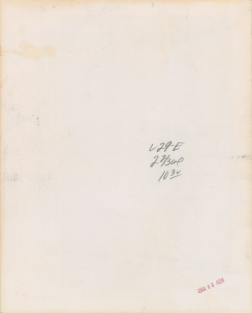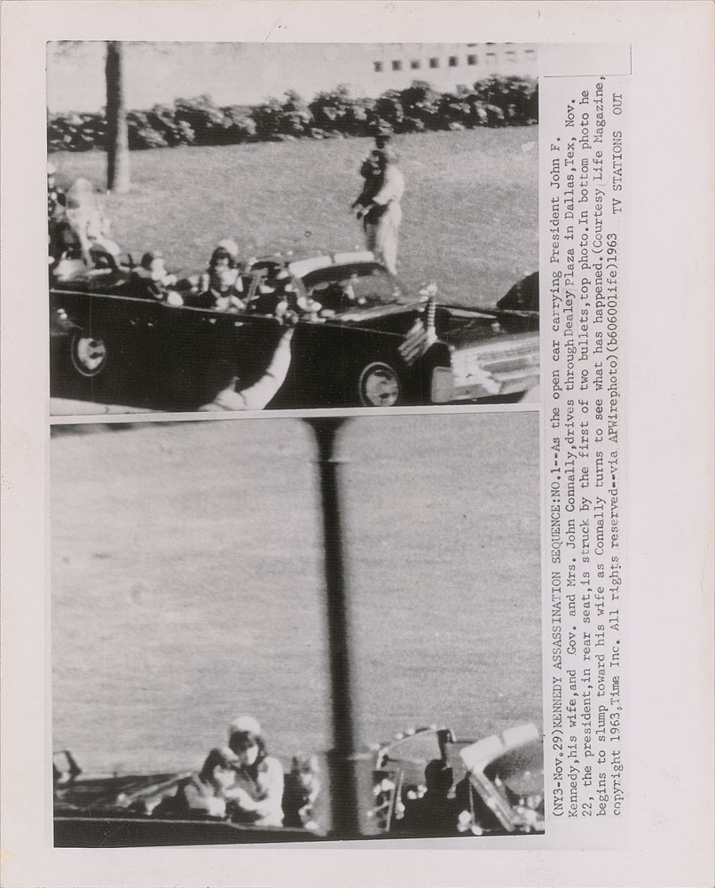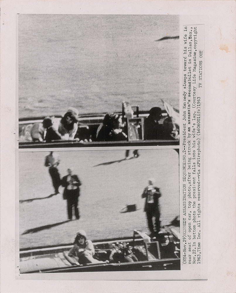 Two original vintage glossy 8 x 10 AP wirephotos portraying the Kennedy assassination, published on November 29, 1963, featuring a sequence of four images from the famed Zapruder film that captured the lethal moments. The inherent captions describe in detail the events portrayed, and note that the images are "Courtesy Life Magazine." Each is stamp-dated November 29, 1963, on the reverse. In overall fine condition, with some slight staining to the second photo. Life Magazine purchased the rights to the Zapruder film, and published blurred black-and-white stills in their issue released on November 29, 1963.