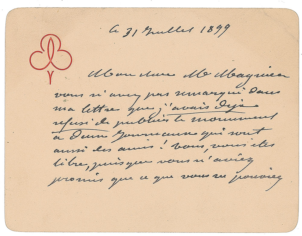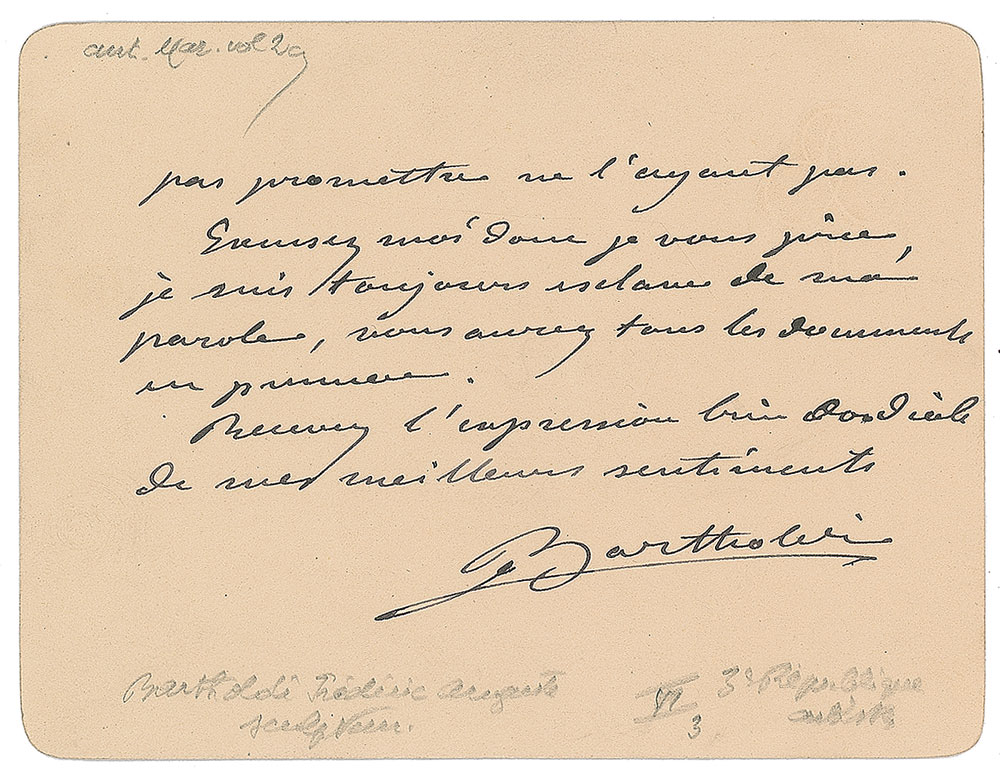 Eminent French sculptor (1834-1904) best known for designing the Statue of Liberty. Untranslated ALS in French, signed “Bartholdi,” on both sides of a 4.5 x 3.5 monogrammed stationery card, July 31, 1899. In fine condition.
