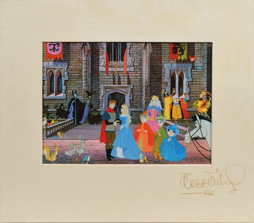 Desirable off-white 17.25 x 15 presentation mat prepared by the studio to exhibit an original cel, prominently signed on the mount in bold brown artist's crayon, "Walt Disney." Displayed in the mat is a color print showing a combination of characters from the films Sleeping Beauty and Cinderella. In fine condition, with light dampstaining and rippling to the mat (heavier to the top); and a somewhat musty odor.
