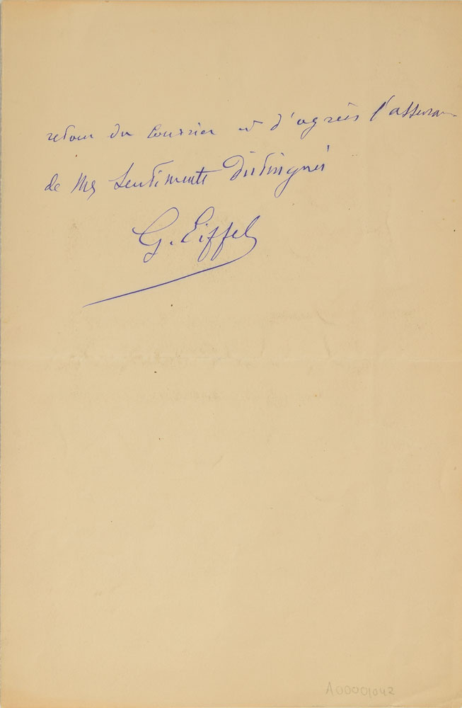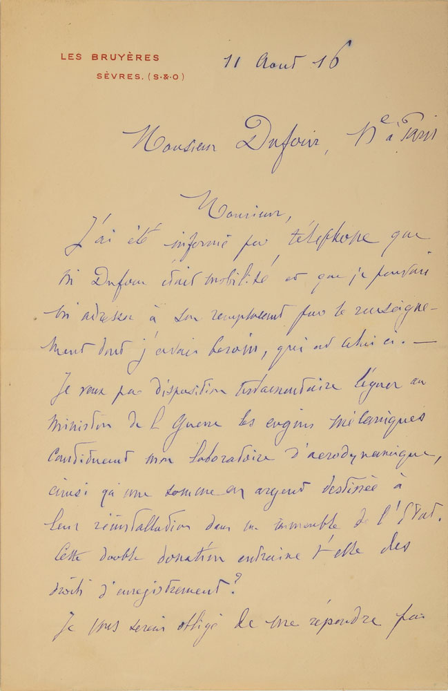 ALS in French, signed “G. Eiffel,” two pages on two adjoining sheets, 5.25 x 8.25, Les Bruyeres letterhead, August 11, 1916. Letter to Mr. Dufour, in part (translated): "I was informed by telephone that Mr. Dufour was drafted and that I should talk to his replacement about the information that I need, which is as follows: I wish to legally donate to the Ministry of War the mechanical devices currently in my aerodynamics laboratory, as well as a sum of money to be used for their transfer to, and installation in some State-owned building. Would this double donation necessitate some filing charges?" In fine condition, with splitting along the hinge. Though best known for his eponymous tower, Eiffel made significant contributions to the scientific study of aerodynamics. Early on, he conducted 'drop tests' of various objects from the Eiffel tower's 377-foot high second platform, and in 1909 expanded his research by building a wind tunnel at its base, where he used fans driven by electric motors to study air resistance in connection with aviation. Known as the 'Eiffel-type' wind tunnel, the designs he developed are still in use today.