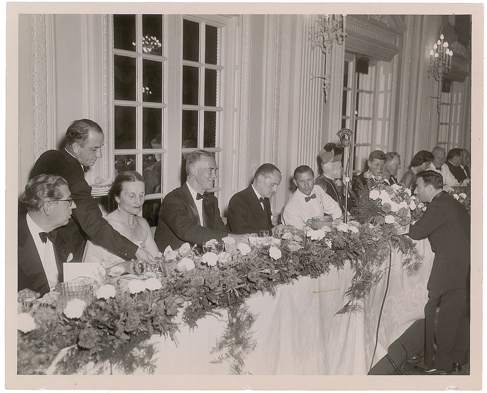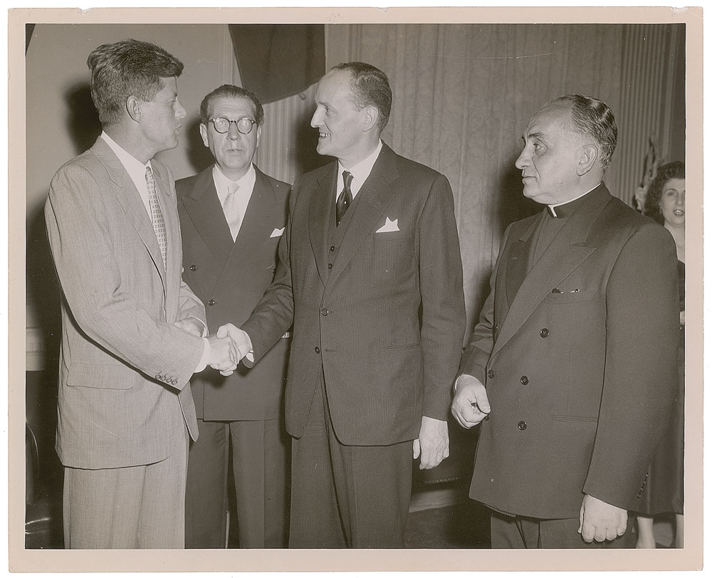Two original vintage glossy 10 x 8 photographs, each marked with a "Fay Foto Service" credit stamp on the reverse. One shows John F. Kennedy with the Italian consul and two other men, and the other shows him dining with Archbishop Cushing, Christian Herter, John Volpe, and others. In fine condition, with scattered light creasing. From the collection of JFK's research assistant, Deirdre Henderson. Accompanied by a letter of provenance from Henderson.