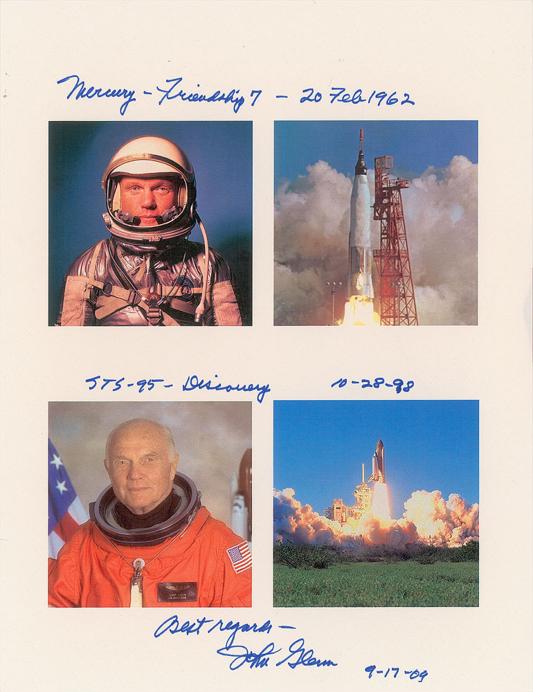 Unusual color 8.5 x 11 paperstock print depicting Glenn's historic missions, annotated and signed in blue felt tip by the astronaut, "Mercury—Friendship 7—20 Feb 1962, STS-95—Discovery 10-28-98, Best regards, John Glenn, 9-17-09." In fine condition.