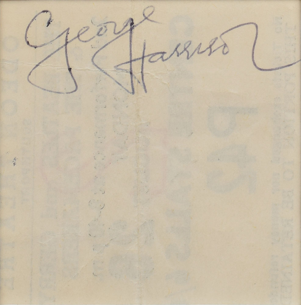 Original ticket stub from the Beatles' 8:40 PM show at the Odeon Theatre in Southport on August 26, 1963, 2.25 x 2.25, signed on the reverse in ballpoint, "George Harrison." Impressively double-matted and framed with a photographic reproduction of the front of the ticket and an image of Harrison to an overall size of 18.5 x 21. In fine condition, with a central vertical fold and light wrinkling. This was the first night of a five-night run at the Odeon, near the end of their 1963 summer tour. Any concert-related signed item is highly prized by Beatles collectors.