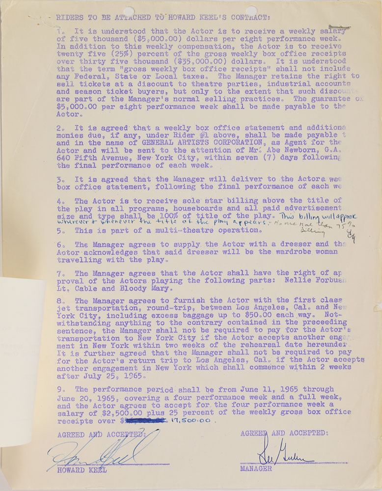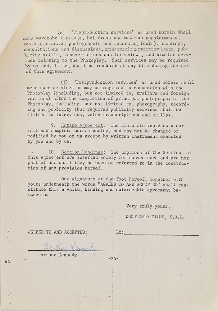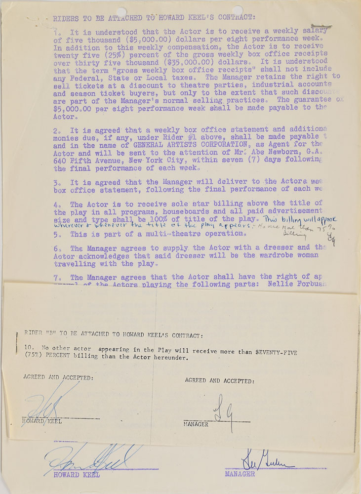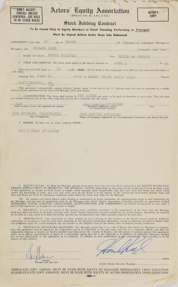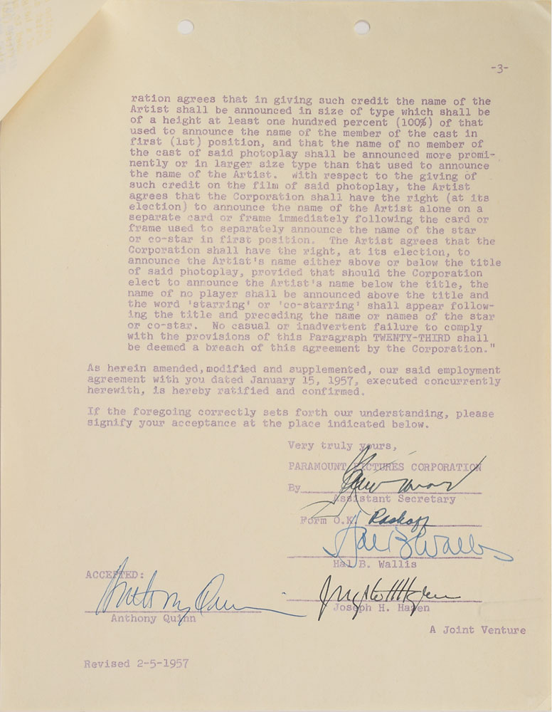 Group of four documents signed by actors, including: Anthony Quinn, Arthur Kennedy, and Howard Keel (2). In overall very good to fine condition. Accompanied by four secretarially signed Keel documents.