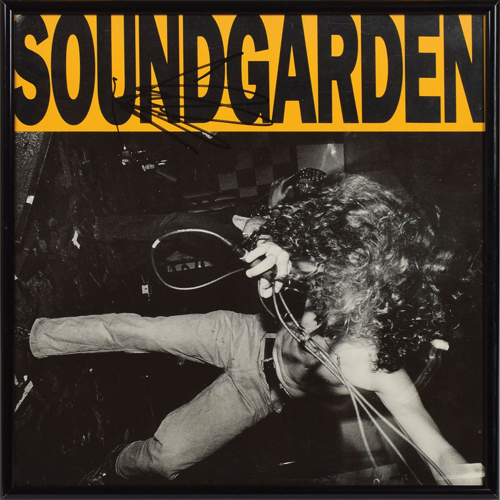 Louder Than Love album flat signed on the front cover in black felt tip by Chris Cornell. Framed and in fine condition.
