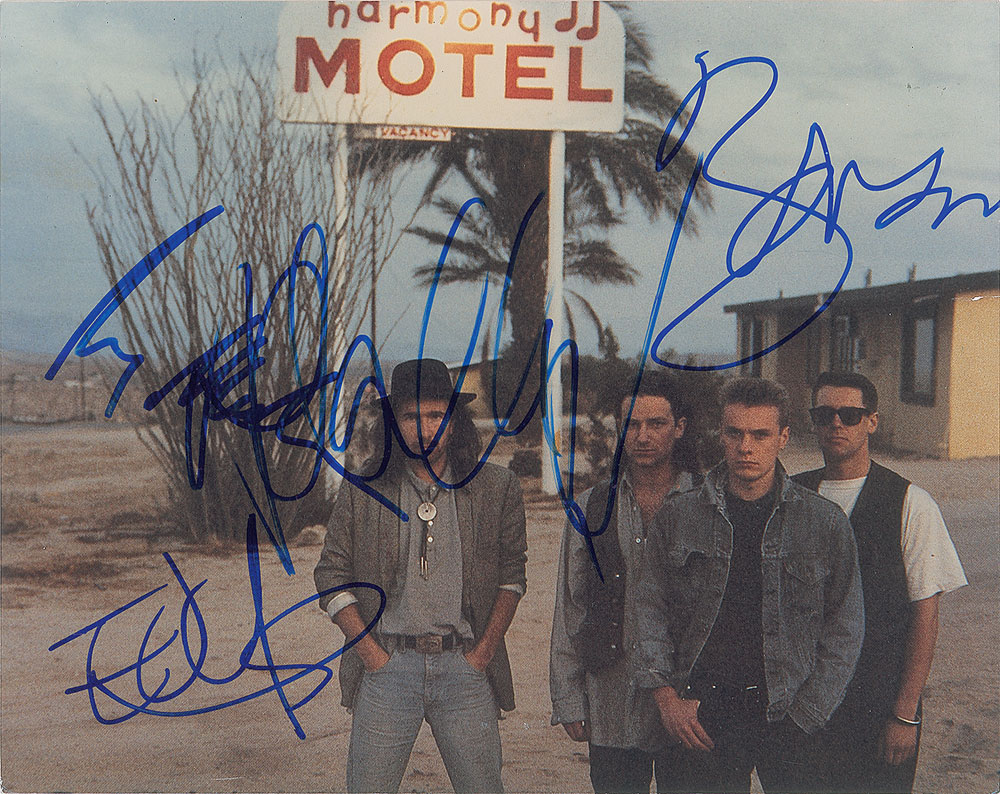 Color glossy 10 x 8 photo of U2 posing in front of the Harmony Motel, signed in blue felt tip, "Larry Mullen," "Adam Clayton," "Bono," and "Edge." In fine condition, with small tears to top and right edges, and a few slight creases, none of which affect image or signatures.