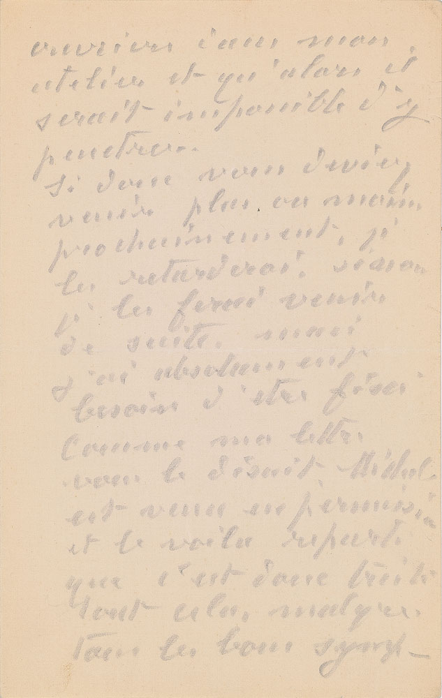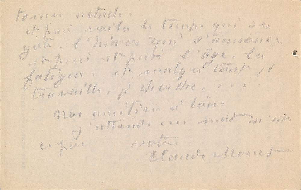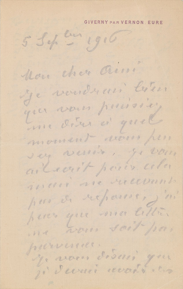 ALS in French, three pages on two adjoining sheets, 5.25 x 8, Giverny par Vernon letterhead, September 5, 1916. Letter to a friend, commenting on France's involvement in World War I. In full (translated): "I would like to know if you can tell me when you are thinking of coming by. I already wrote to you to find out but without any reply. I am afraid my letter might not have reached you. I told you I would have some craftsman over in my studio and that’s why it will be impossible to enter it. Since you are coming over so soon, I delayed the craftsman. Otherwise, I would have them come immediately as I absolutely need it to be fixed. As my letter told you, Michel was back on furlough, but he is back again now [in the war]. This is all so sad. And now, even the weather gets bad. The winter that is coming, and then age and fatigue, and despite everything I work, I search. Sending my love to Louis. I am waiting for a word." In fine condition, with a light corner crease.