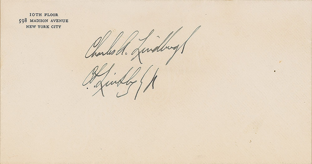 Unusual fountain pen signature by aviator Charles Lindbergh, "Charles A. Lindbergh, C. A. Lindbergh, Jr.,” on an off-white 7.5 x 4 stationery envelope for 598 Madison Avenue, New York City. Affixed to a slightly larger card and in fine condition. Accompanied by a somewhat erroneous small note in an unknown hand: "The upper signature is Col. Lindbergh's normal signature. The lower one is a copy of his father's signature, which he himself uses in signing checks." Lindbergh discontinued the frequent use of the "Jr." version of his signature shortly after his father's death in 1924; rather than being a copy of his father's signature, this is simply an example of two different versions of the aviator's own signature used during different points in his life.
