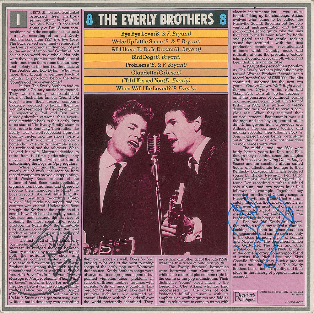 The Everly Brothers album sleeve from a Reader's Digest record compilation, signed in black felt tip by Don Everly and in blue felt tip by Phil Everly. In fine condition. The record is not included.