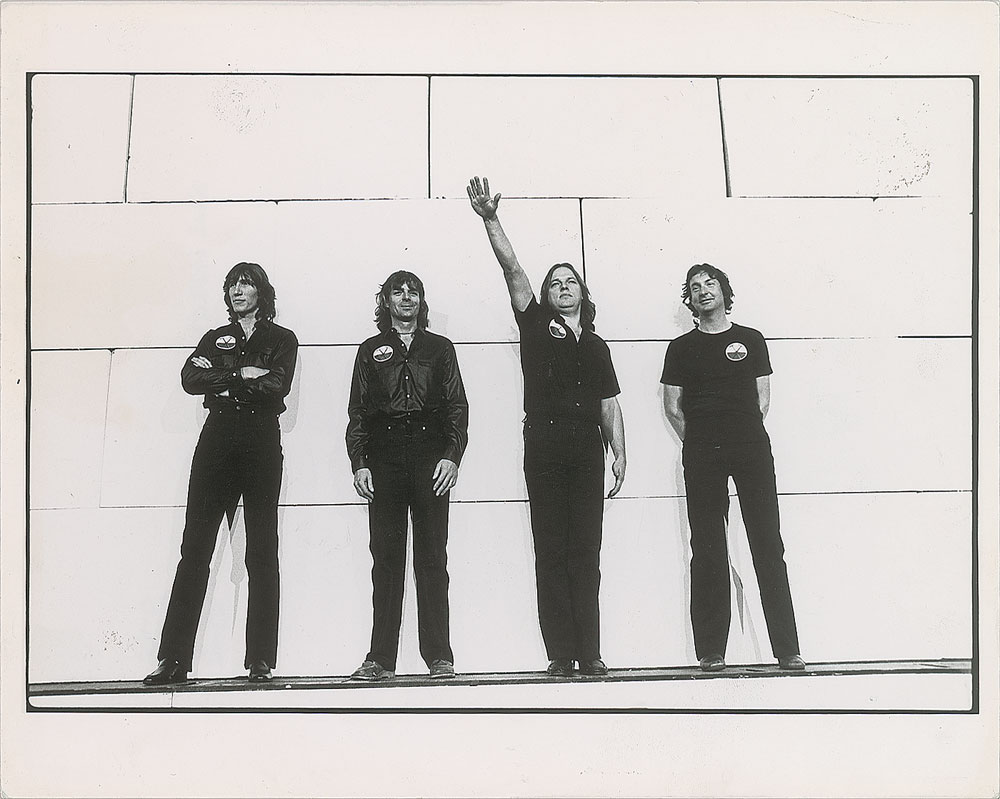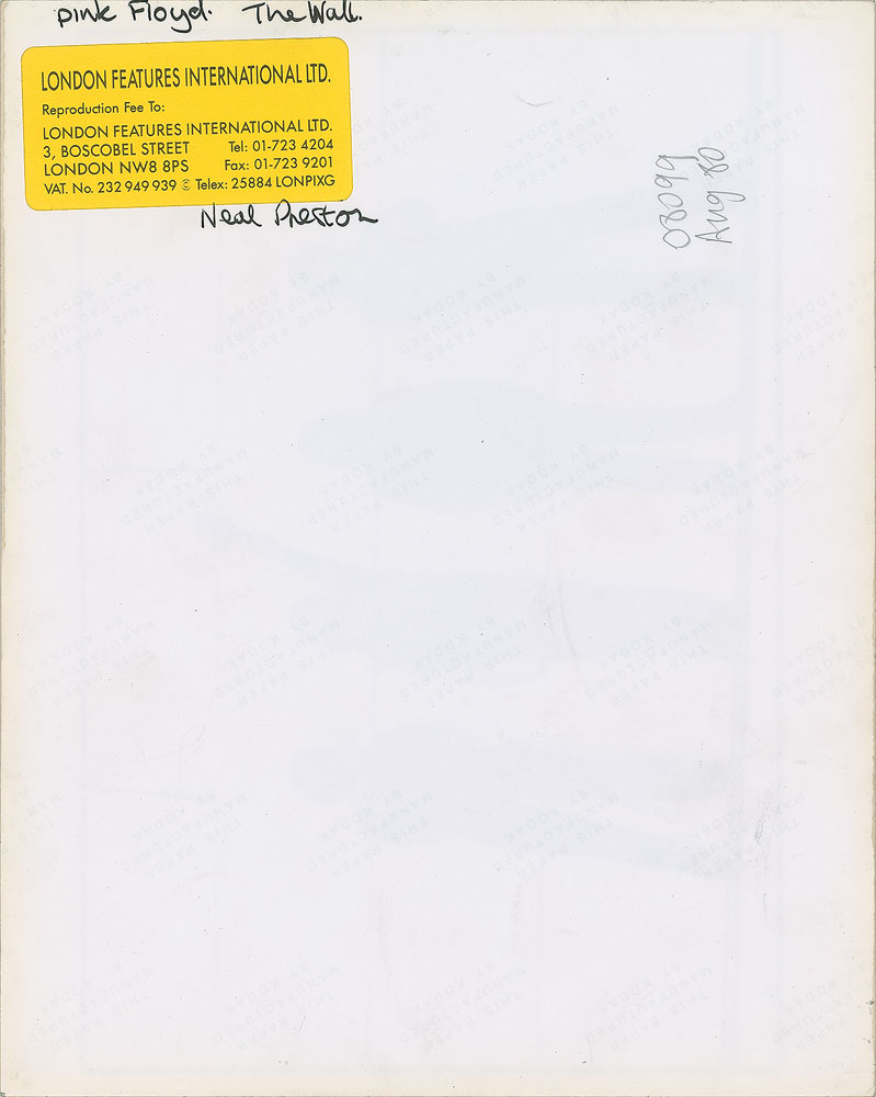 Original vintage circa 1980 glossy 10 x 8 silver gelatin photo of Pink Floyd in Los Angeles during a promo shoot for The Wall. Reverse bears a London Features International label, handwritten Neal Preston credit, and "This paper manufactured by Kodak" watermarks. In fine condition. Neal Preston is a legendary rock photographer best known for his collaborations with Led Zeppelin, Queen, The Who, Bruce Springsteen, Fleetwood Mac, and Michael Jackson. From the Globe Photo archives.