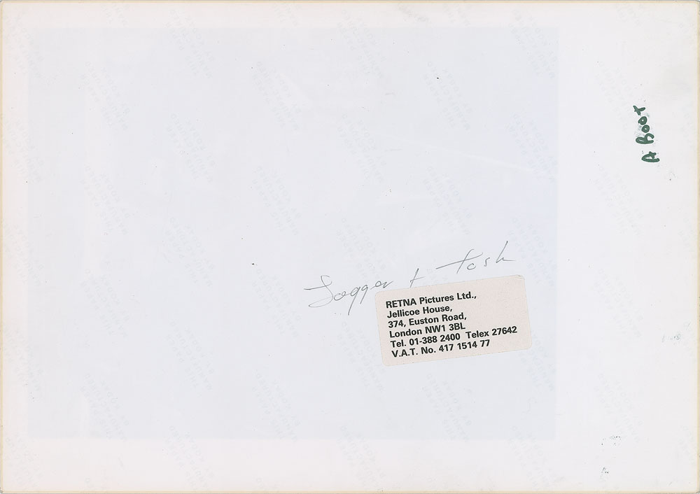 Original matte-finish 8.25 x 11.75 silver gelatin photo of Mick Jagger and Peter Tork in 1968, printed from the original negative circa 1970s-80s. Reverse bears a handwritten Adrian Boot credit, RETNA Pictures label, and "This paper manufactured by Kodak" watermarks. In fine condition, with stray ink marks to the bottom edge. Adrian Boot is one of Britain’s most celebrated music photographers. He was the staff photographer for Melody Maker, and also shot for NME, The Face, The Guardian and The Times (of London). He has photographed a wide variety of musicians, including the Sex Pistols, Clash, Damned, Jimmy Page, Bob Marley & The Wailers, the Grateful Dead in Egypt, and Live Aid. From the Globe Photo archives.