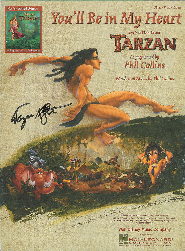 Collection of six sheet music booklets for songs from famous Walt Disney animated movies, each measuring 9 x 12, signed on the front cover in felt tip by one or more voice actors or singers, with a couple inscribed, including: Vanessa Williams (Pocahontas); Jodi Benson (The Little Mermaid); Jerry Orbach, Paige O'Hara, and Robby Benson (Beauty and the Beast); Ernie Sabella, Nathan Lane, and Matthew Broderick (The Lion King); Lea Salonga, Jonathan Freeman, and Brad Kane (Aladdin); and Wayne Knight (Tarzan). In overall fine condition. Learn more about our Animation Expert Harry Kleiman