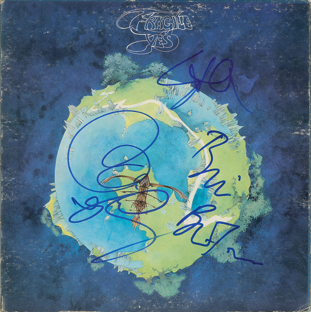 Fragile album signed on the front cover in blue felt tip by Steve Howe, Bill Bruford, Rick Wakeman, and Jon Anderson. In very good to fine condition, with light overall scuffing. The record is not included.