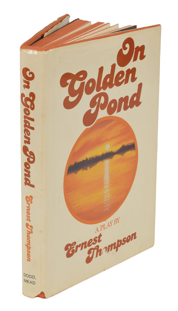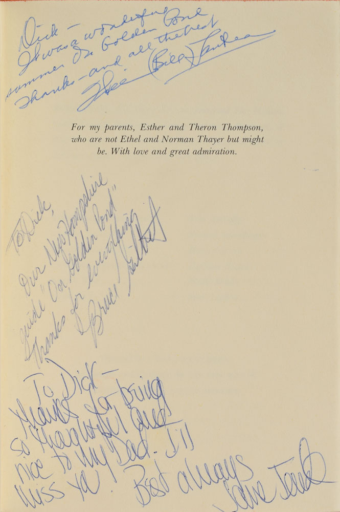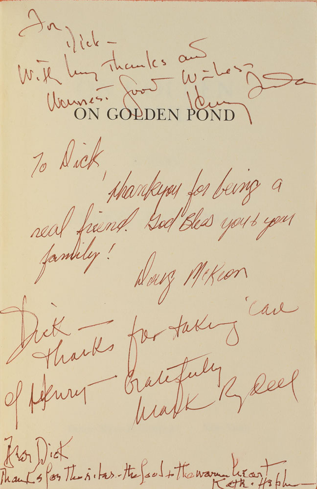 Signed book: On Golden Pond. First edition. NY: Dodd, Mead & Company, 1979. Hardcover with dust jacket, 5.75 x 8.5, 191 pages. Signed and inscribed on the half-title page in brown felt tip, "For Dick—With my thanks and warmest good wishes, Henry Fonda," "For Dick, Thanks for the rides, the food, & the warm heart, Kate Hepburn," "To Dick, thank you for being a real friend. God bless you & your family! Doug McKeon," and "Dick—Thanks for taking care of Henry—Gratefully, Mark Rydell." Also signed and inscribed on the dedication page in blue ballpoint, "Dick—It was a wonderful summer On Golden Pond, Thanks—and all the best, Will (Bill) Lanteau," "To Dick, Our New Hampshire guide 'On Golden Pond,' Thanks for everything, Bruce Gilbert," and "To Dick—Thanks for being so thoughtful and nice to my Dad. I'll miss you! Best always, Jane Fonda." In fine condition, with some wear and chipping to the dust jacket.
