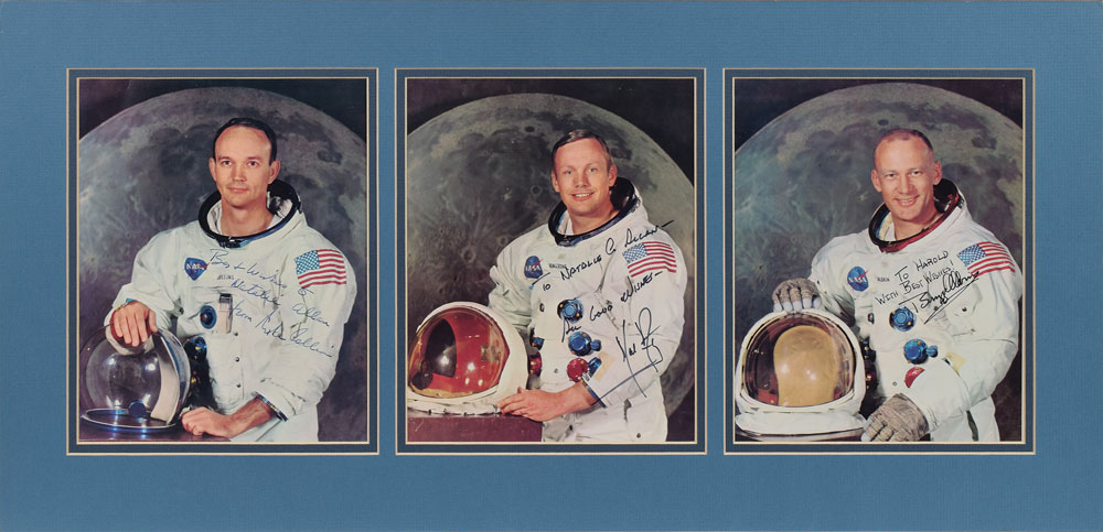 Terrific set of official color NASA lithographs of the crew of Apollo 11, each measuring 7.25 x 9.25, individually signed and inscribed in black felt tip: Collins is signed and inscribed, ”Best wishes to Natalie Allan, from Mike Collins”; Armstrong is signed and inscribed, "To Natalie C. Allan—All good wishes—Neil Armstrong”; and Aldrin is secretarially inscribed, "To Harold, with best wishes!," and signed by the astronaut, "Buzz Aldrin." The set is double-matted to an overall size of 28 x 13.5. In overall fine condition.