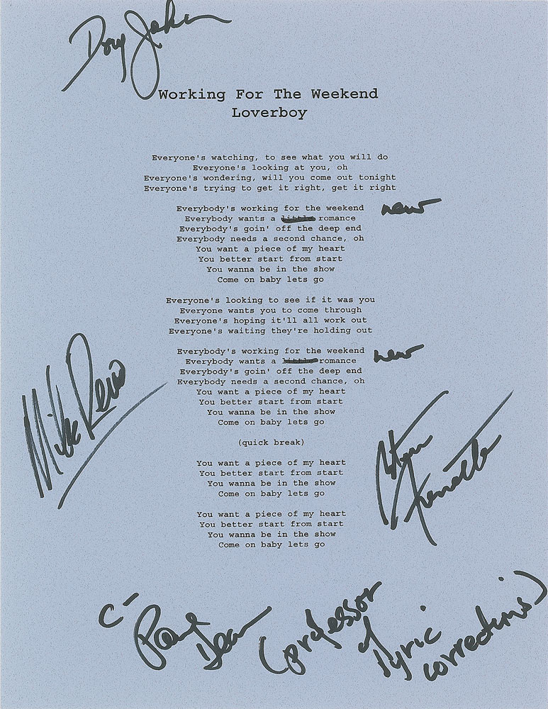 Souvenir lyric sheet for the song 'Working for the Weekend' by Loverboy, one page, 8.5 x 11, signed in black felt tip by Mike Reno, Doug Johnson, Matt Frenette, and Paul Dean, who makes two corrections to the lyrics and adds to his signature, "(professor of lyric corrections)." In very fine condition.