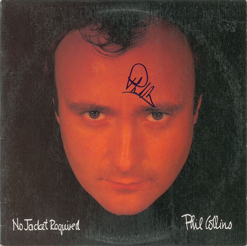 Three signed albums: Blondes Have More Fun vertically signed on the front cover in blue felt tip by Rod Stewart; No Jacket Required signed on the front cover in blue felt tip by Phil Collins; and Sports signed on the front cover in blue felt tip by Huey Lewis. In overall fine condition, with some scattered creasing. The Blondes Have More Fun and Sports records are included, with the latter accompanied by a certificate of authenticity from JSA.
