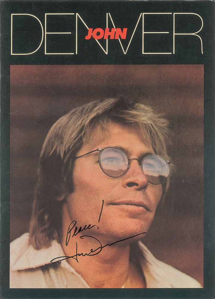 Vintage 1980 tour program for John Denver, twenty pages, 10 x 14, signed on the front cover in black felt tip, "Peace! John Denver." In fine condition, with trivial creases to cover. Accompanied by a full letter of authenticity from REAL.
