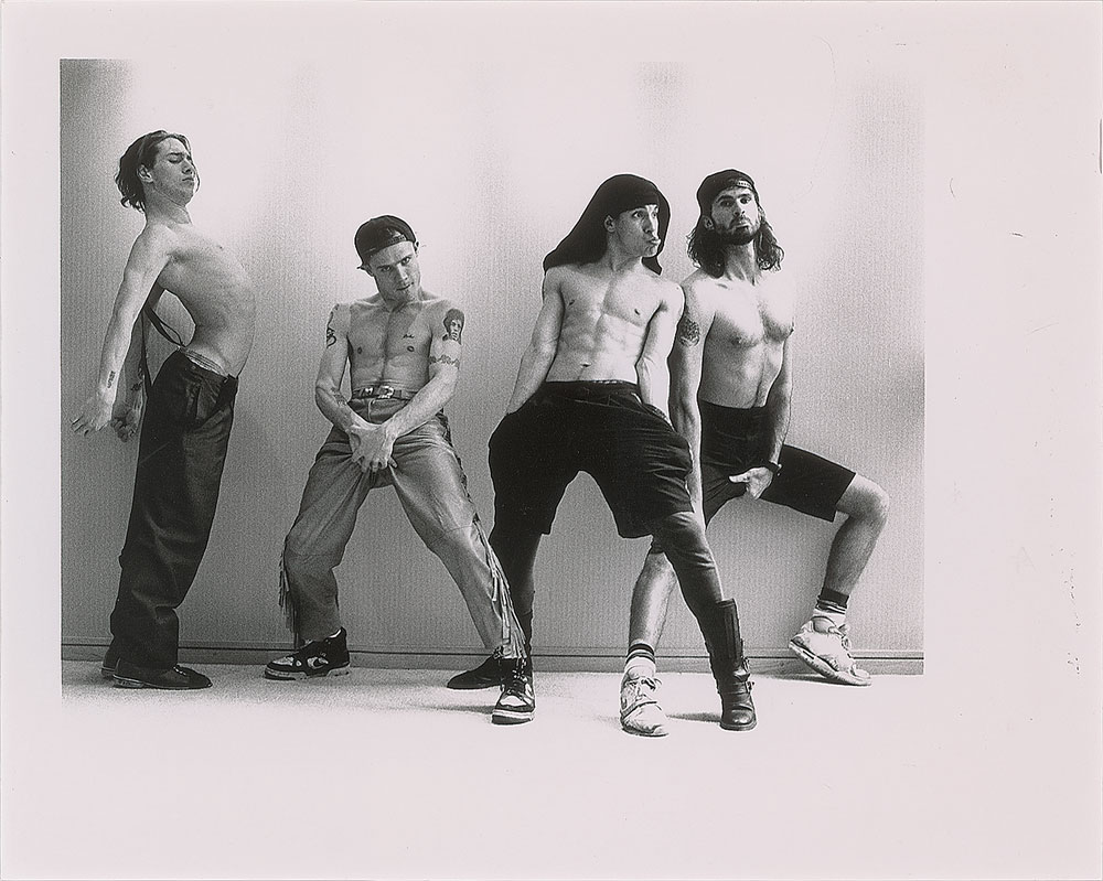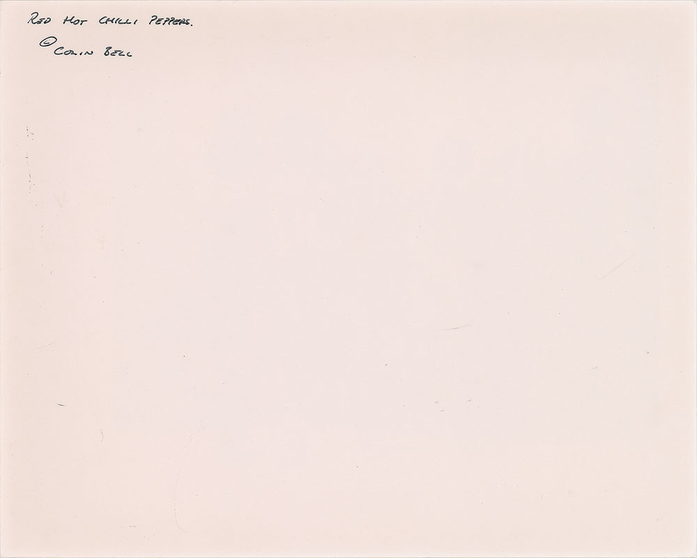 Original satin-finish 10 x 8 full-length photo of the Red Hot Chili Peppers during an early goofy photo shoot. Reverse annotated with the name of photographer Colin Bell. In fine condition. From the Globe Photo archives.