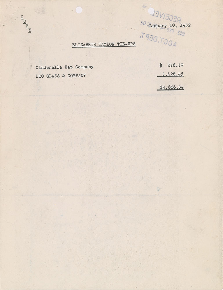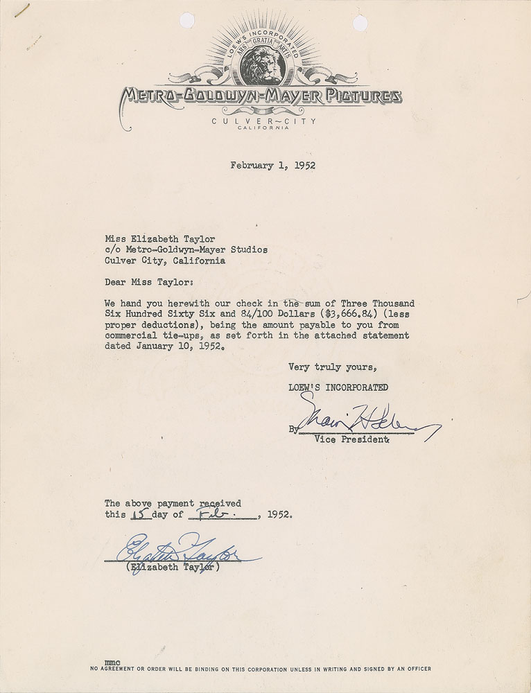 DS, two pages, 8.5 x 11, February 15, 1952. MGM document pertaining to a payment, in full: "We hand you herewith our check in the sum of Three Thousand Six Hundred Sixty Six and 84/100 Dollars ($3,666.84) (less proper deductions), being the amount payable to you from commercial tie-ups, as set forth in the attached statement dated January 10, 1952." Signed at the conclusion in fountain pen by Taylor to confirm receipt. The accompanying statement lists payments from the Cinderella Hat Company and Leo Glass & Company. In fine condition.