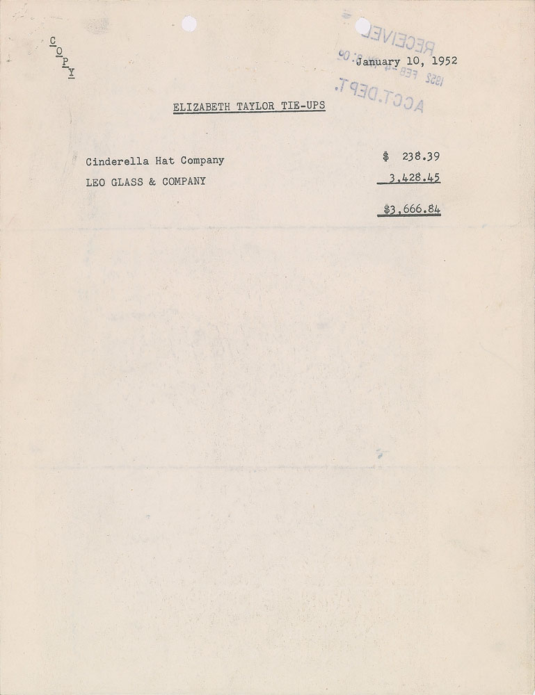 DS, two pages, 8.5 x 11, February 15, 1952. MGM document pertaining to a payment, in full: "We hand you herewith our check in the sum of Three Thousand Six Hundred Sixty Six and 84/100 Dollars ($3,666.84) (less proper deductions), being the amount payable to you from commercial tie-ups, as set forth in the attached statement dated January 10, 1952." Signed at the conclusion in fountain pen by Taylor to confirm receipt. The accompanying statement lists payments from the Cinderella Hat Company and Leo Glass & Company. In fine condition.