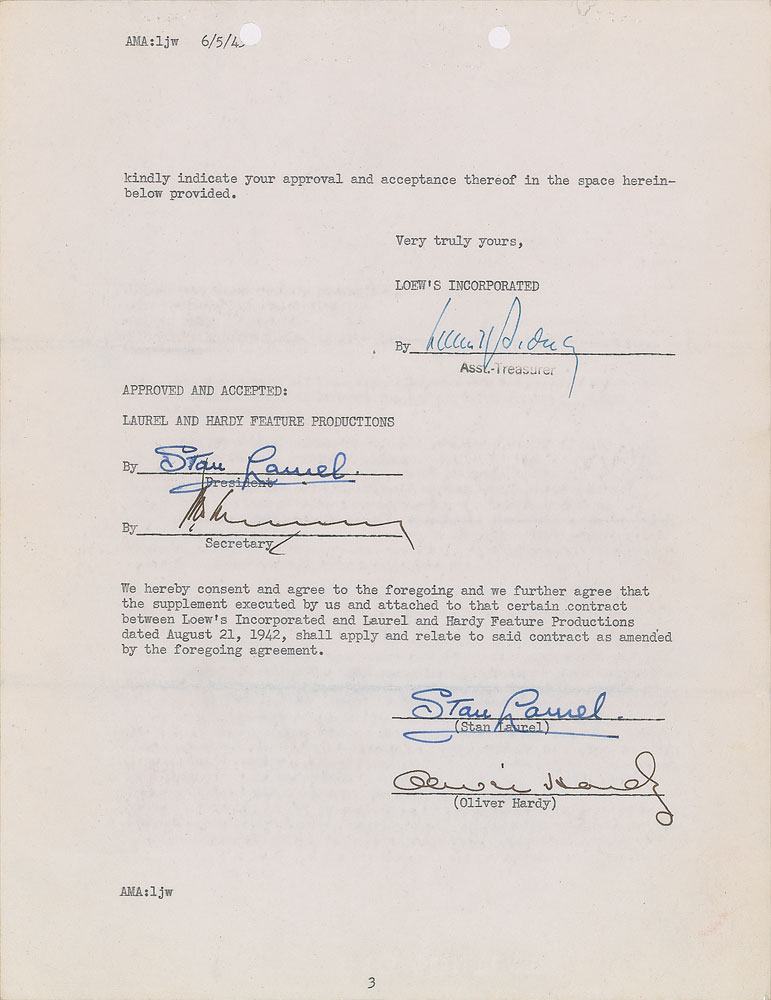 DS, signed “Stan Laurel" and "Oliver Hardy,” one page, 8.5 x 11, circa 1940s. Final page of a document concerning the contract between Loew's Incorporated and Laurel and Hardy Feature Productions dated August 21, 1942, signed twice at the conclusion in fountain pen by Stan Laurel and once by Oliver Hardy. Countersigned by a secretary and a Loew's assistant treasurer. In fine condition. A scarce format signed by both halves of the great comedic duo.